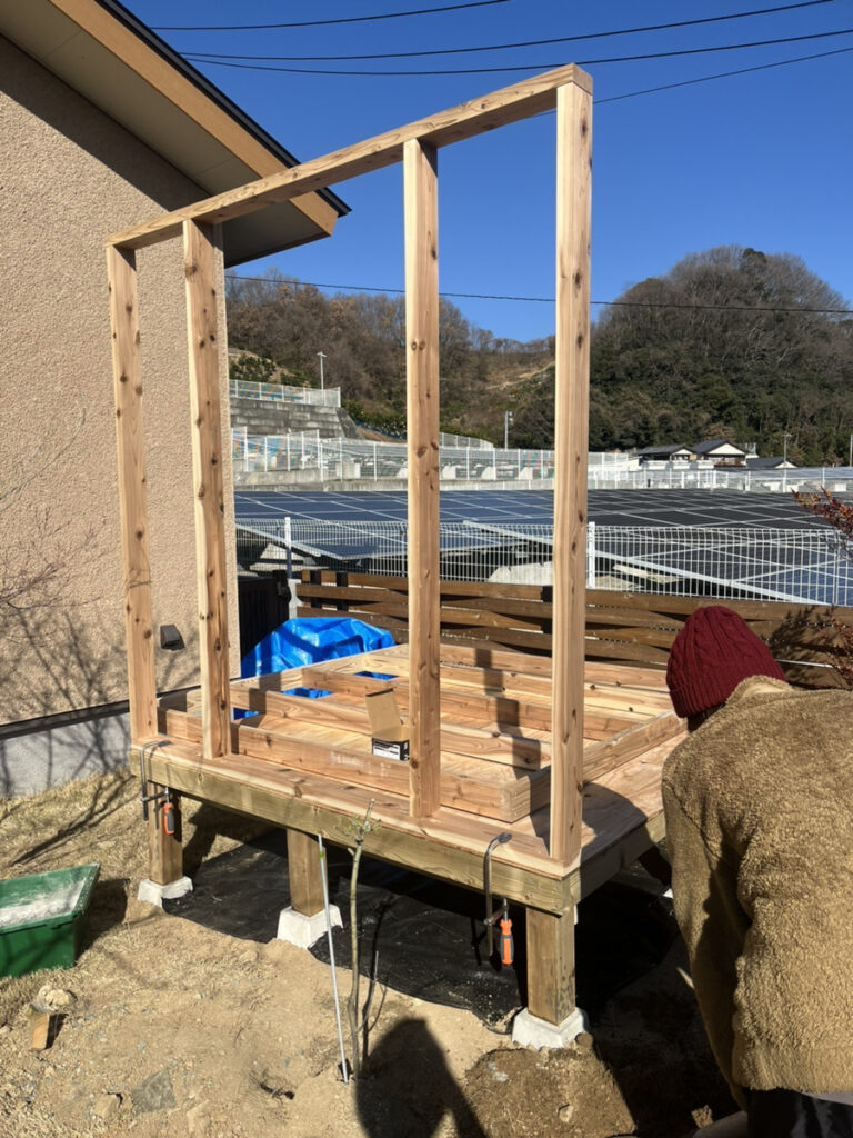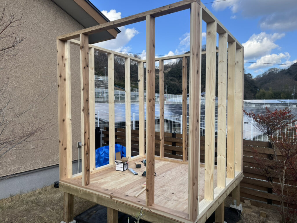 針葉樹合板が張れたら、なんだかだいぶ小屋になってきた感じがします。