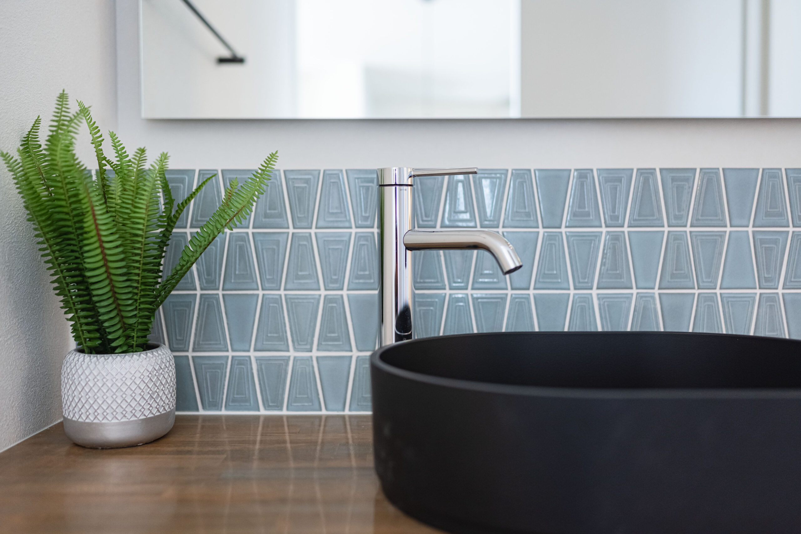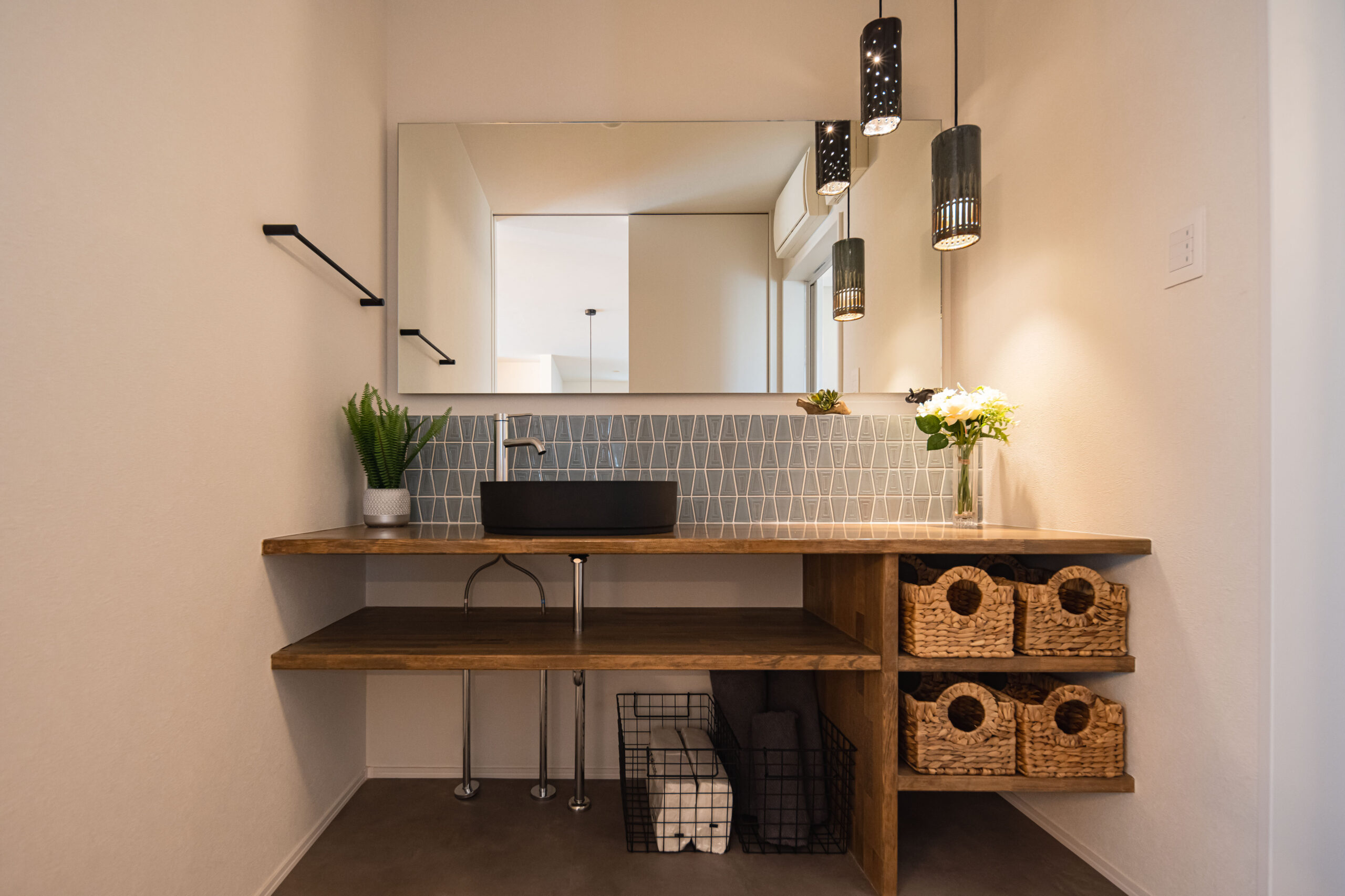 03 | タイルと陶器の照明が彩る、造作洗面台